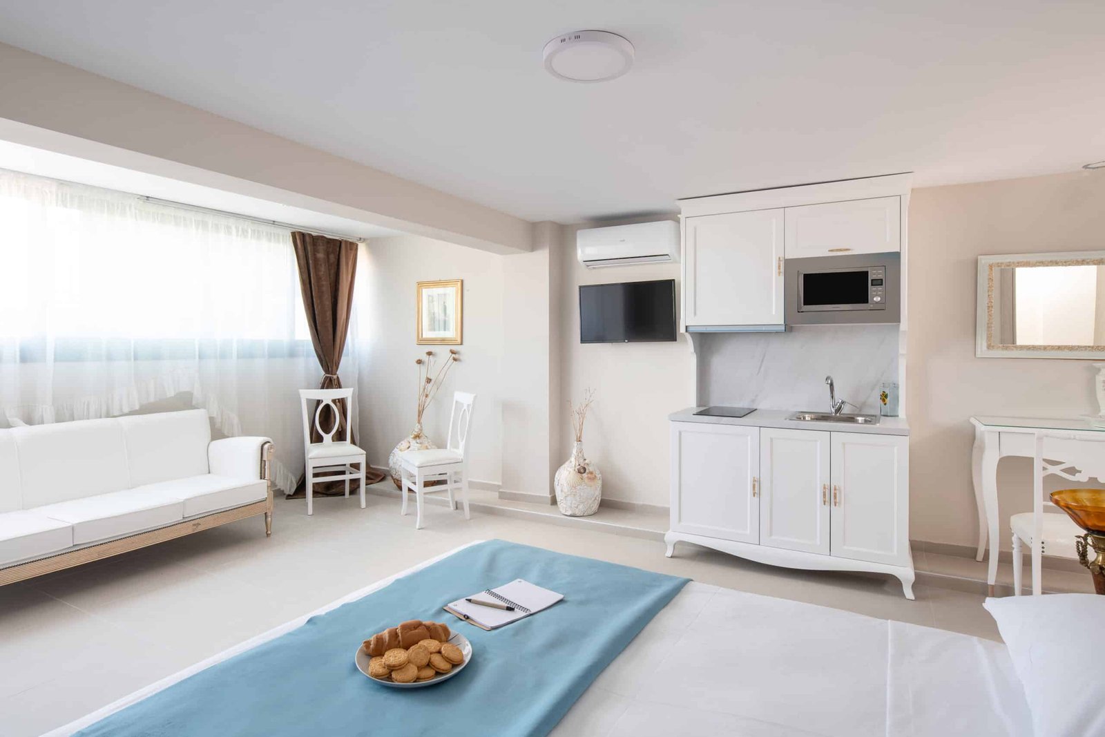 Τα δωμάτια είναι σουίτες, δίκλινες και τετράκλινες, όλες μπροστά στη θάλασσα. Το κατάλυμα διαθέτει 2 δίκλινες σουίτες και 8 τετράκλινες σουίτες. Τα δωμάτια περιλαμβάνουν υπέρδιπλο κρεβάτι με κατάλευκα βαμβακερά λευκά είδη, δωρεάν Wi-Fi, κλιματισμό, mini bar, δορυφορική τηλεόραση smart, φούρνο μικροκυμάτων, στεγνωτήριο μαλλιών, ντούζ, ηχομόνωση, πυροσβεστήρες, έπιπλα εξωτερικού χώρου, μεγάλα ευρύχωρα μπαλκόνια με υπέροχη θέα.