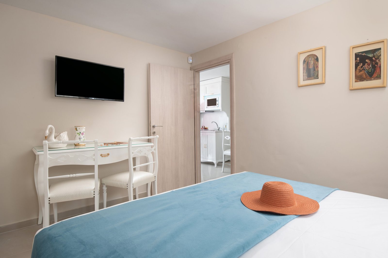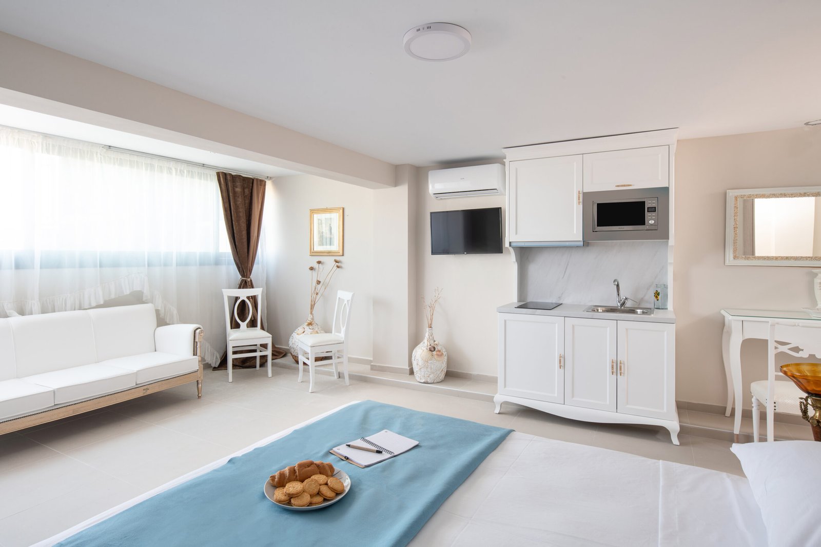 Όλα τα δωμάτια είναι δίκλινα μη καπνιζόντων και περιλαμβάνουν υπέρδιπλο κρεβάτι με κατάλευκα βαμβακερά λευκά είδη, δωρεάν Wi-Fi, κλιματισμό, mini bar, δορυφορική τηλεόραση smart, φούρνο μικροκυμάτων, στεγνωτήριο μαλλιών, ντούζ, ηχομόνωση, πυροσβεστήρες, έπιπλα εξωτερικού χώρου, μεγάλα ευρύχωρα μπαλκόνια με υπέροχη θέα, απολύμανση και καθάρισμα με ατμοκαθαριστή σε κάθε αλλαγή πελάτη και πολύ μεγάλα ηχομονωτικά κουφώματα. Παιδικά παιχνίδια και κούνιες (εφόσον ζητηθούν).